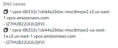 For example, the primary DNS name that we got from previous step would be .vpce-1a2b3c4d-5e6f.s3.us-east-1.vpce.amazonaws.com . Just replace the * with the word bucket. This would be DNS endpoint for connecting to S3 using interface endpoint ( which in turn uses PrivateLink)