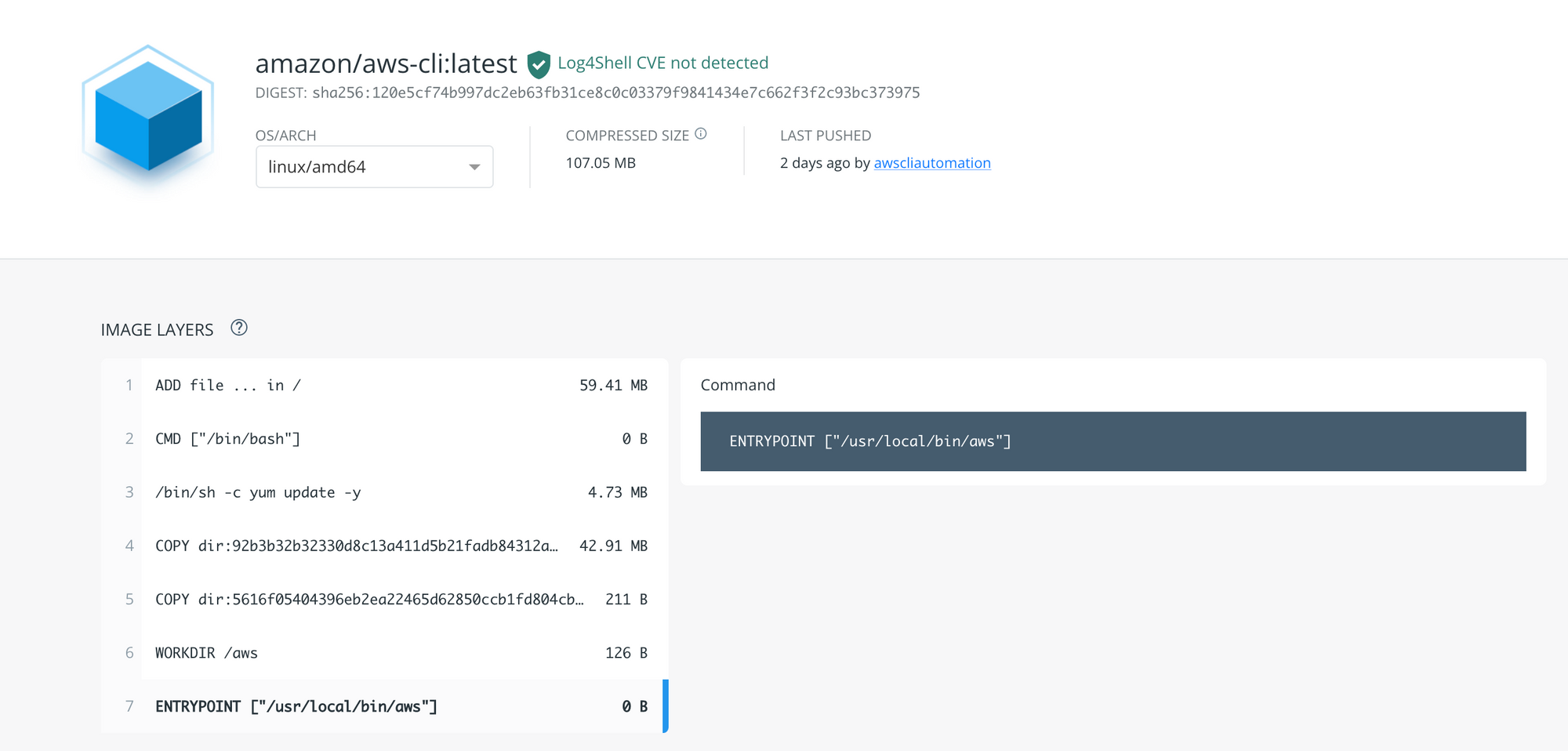 When you see image layers of amazon/aws-cli, the entrypoint is defined as "/usr/local/bin/aws' .