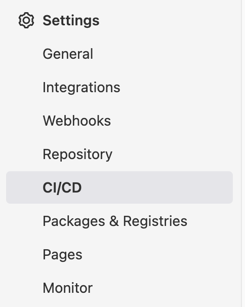 Before creating deploy job - we need to create CI CD variables in gitlab. In left hand side menu, select Settings -> CI/CD