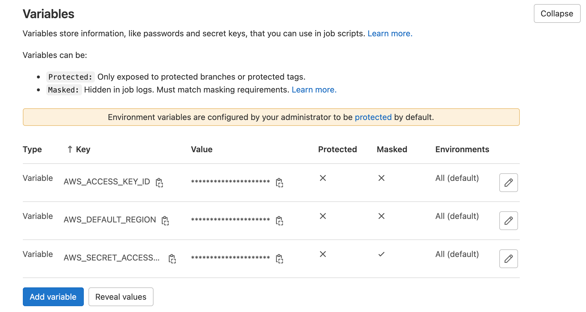 You've to create 3 variables - AWS_ACCESS_KEY_ID representing AWS access key , AWS_SECRET_ACCESS_KEY representing secret key and AWS_DEFAULT_REGION representing AWS region. Please note that the name of these variables should be as mentioned above. This is because AWS CLI would look for these variable when trying to execute AWS CLI commands.