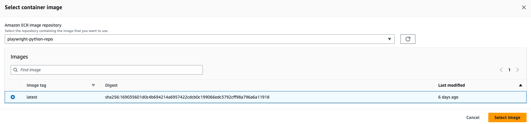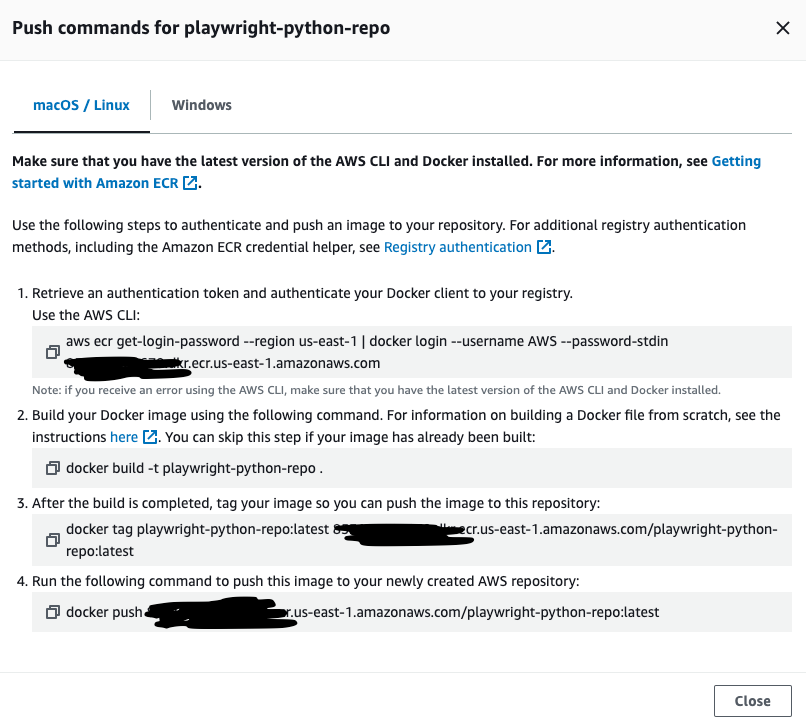 You can build and push the image to AWS ECR. In this example, I'm going to push the code to the ECR repo playwright-python-repo from CLI Â - just for the sake of simplicity. You can get the commands by clicking "View Push Commands" button at ECR.