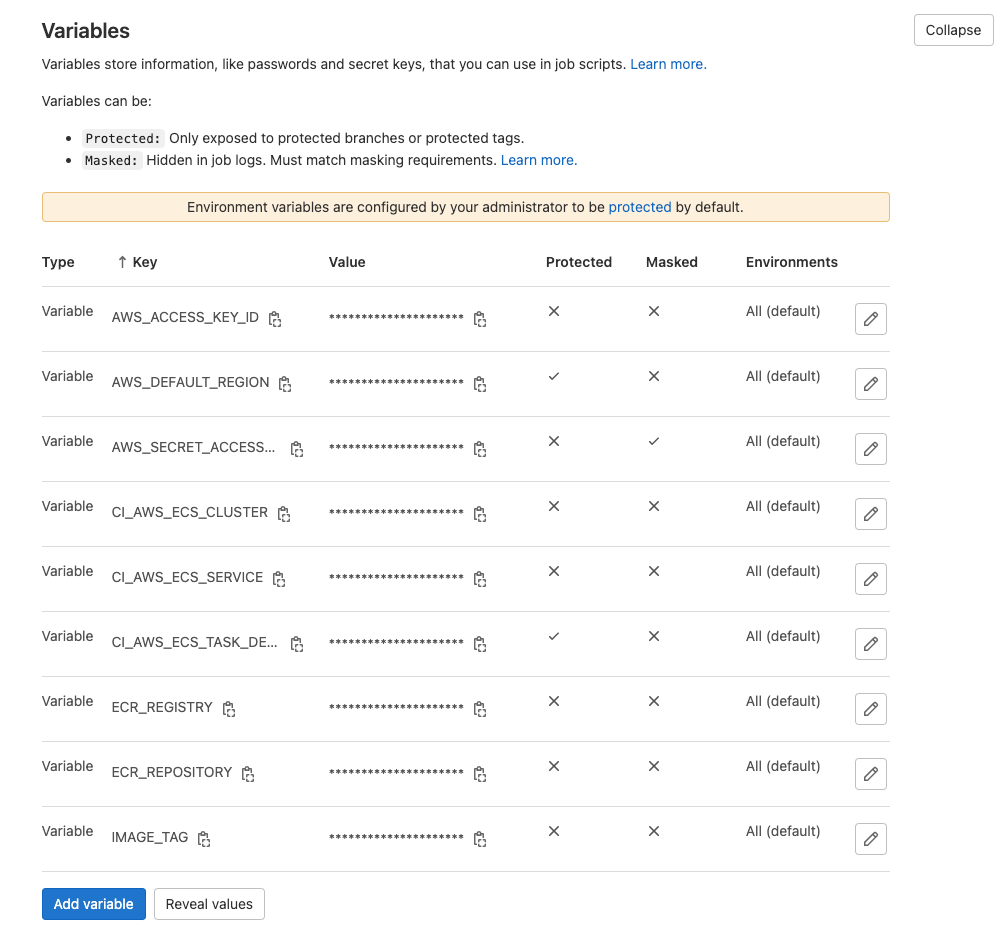 CI/CD variables in Gitlab project repository: